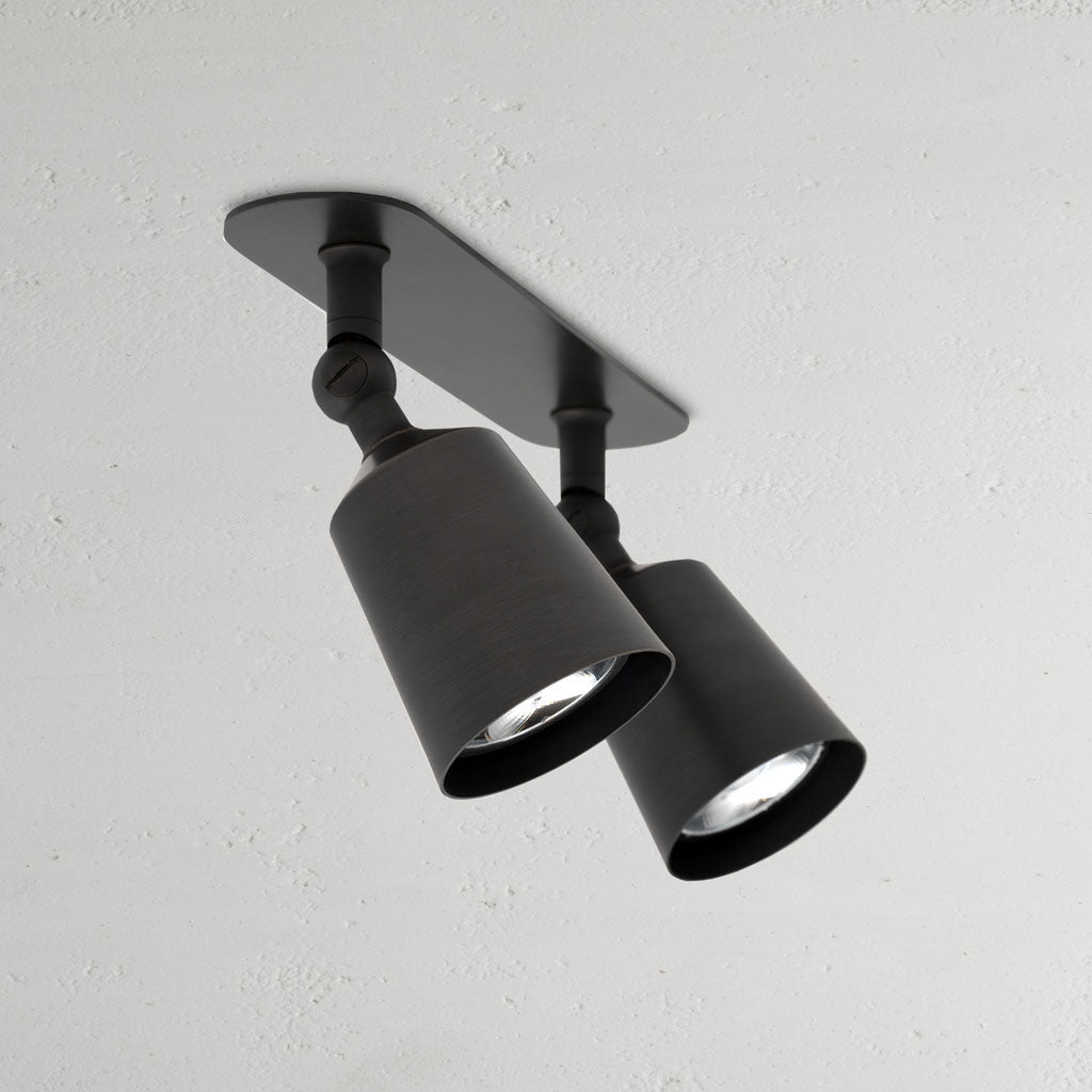 The electric connections in the Perryn double ceiling spotlight are tucked away, while a spring mechanism secures the mounting plate to plasterboard.