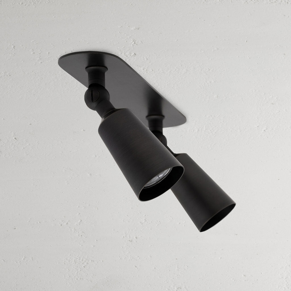 The electric connections in the Perryn Small Double Spotlight are tucked away, while a spring mechanism secures the mounting plate to a plasterboard ceiling.