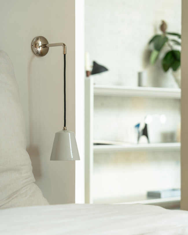 Polished nickel is our answer to chrome. It’s a bit warmer, which we think is more versatile, so you can use it with warm or cool colour palettes. Pair it with the fine porcelain shade for a classic look.