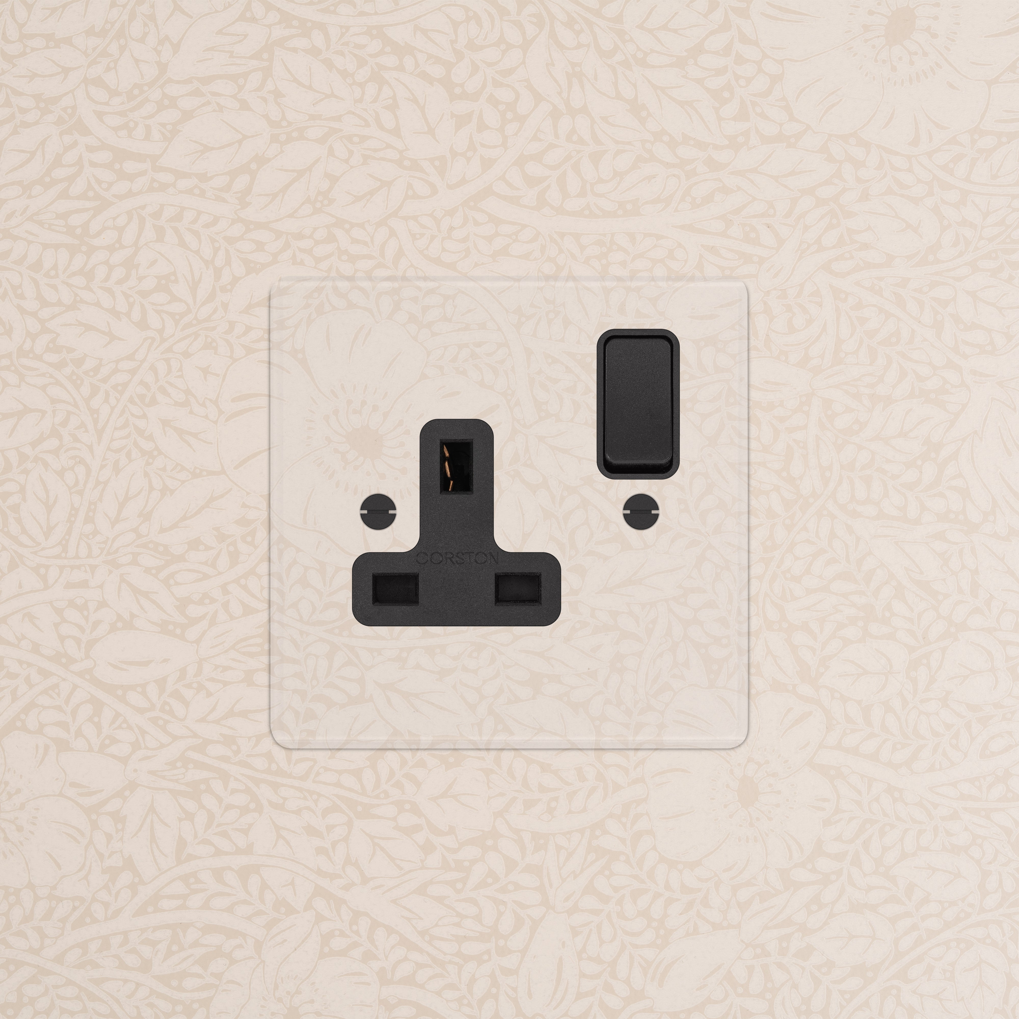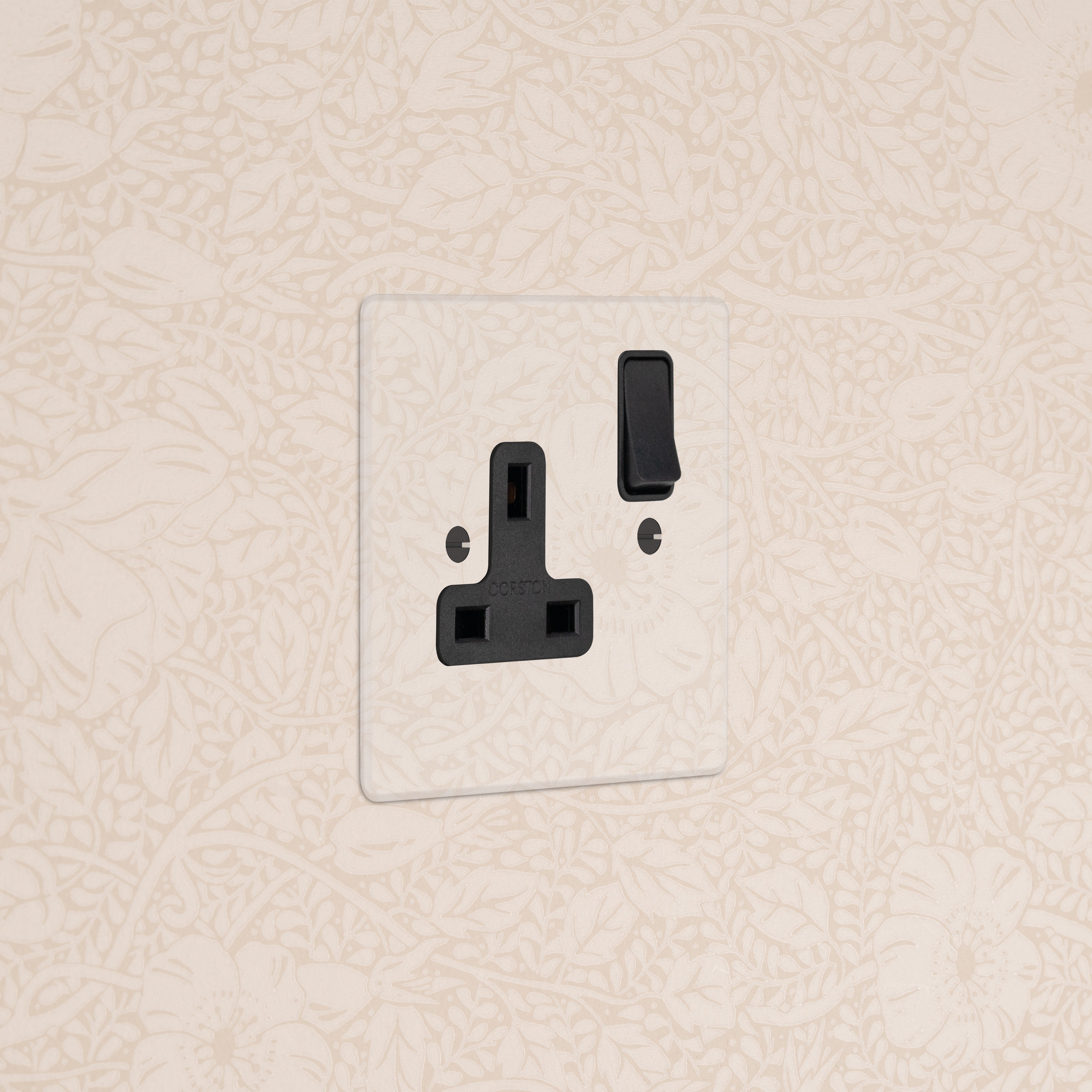 The low-sheen, slightly textured plastic switch and the insert around the socket comes in black (like this one) or white.