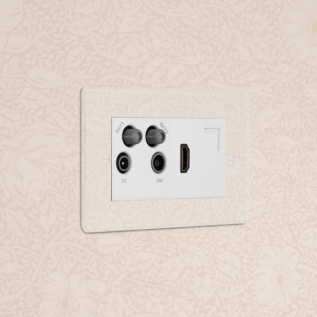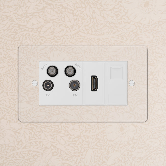 This double mixed socket combines an aerial socket, HDMI and CAT6 socket on one plate and keeps cable clutter to a minimum.
