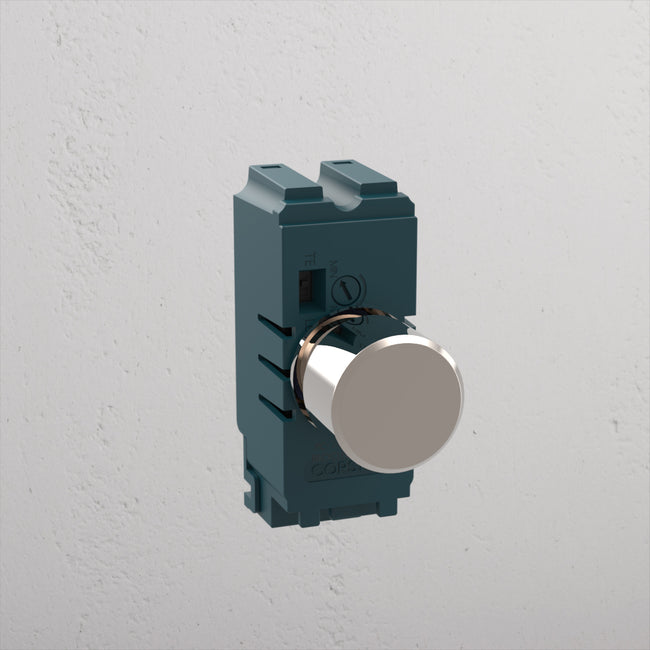 This polished nickel rotary dimmer switch works with our clear switch plates. It has a collar underneath the rotating knob that hides all the working parts.