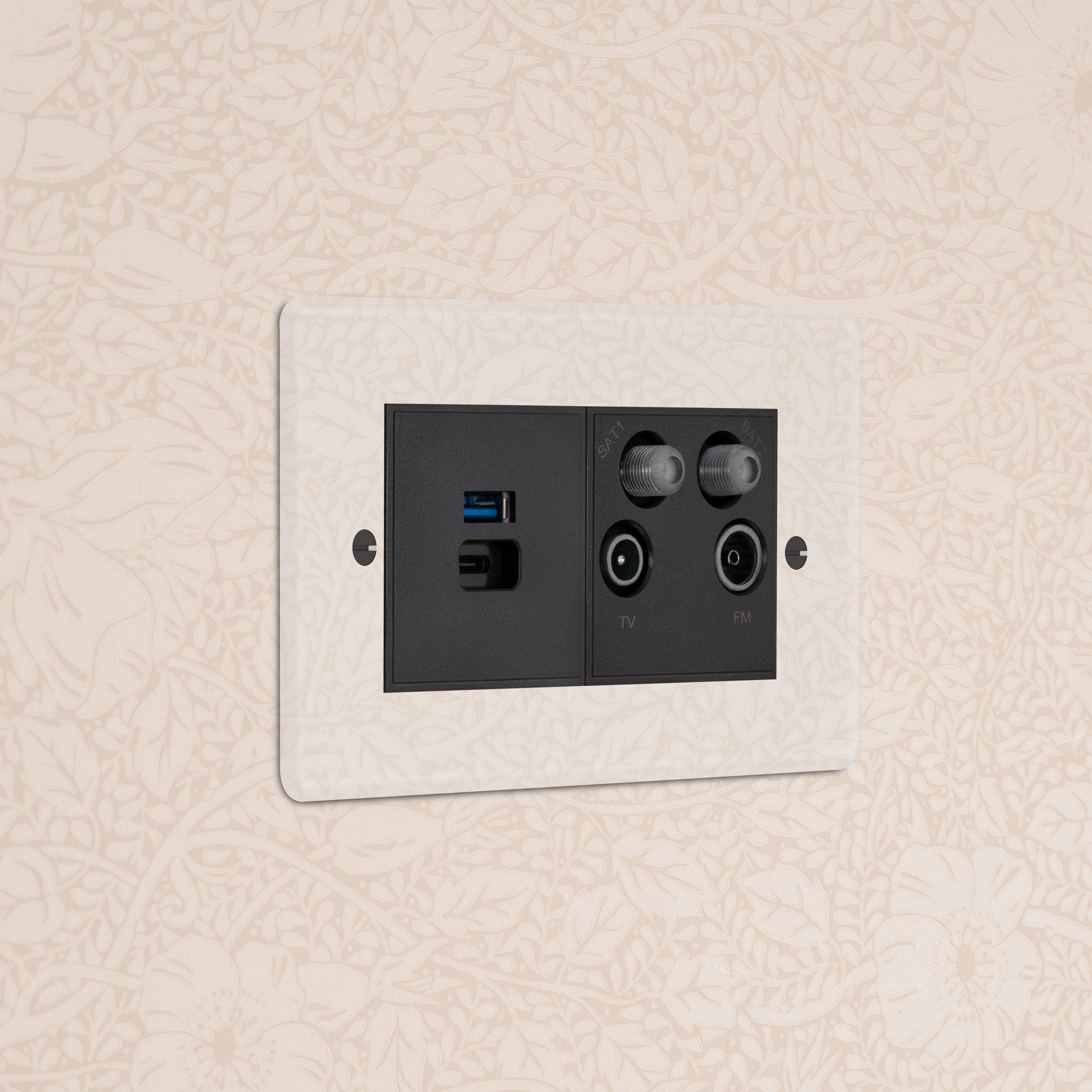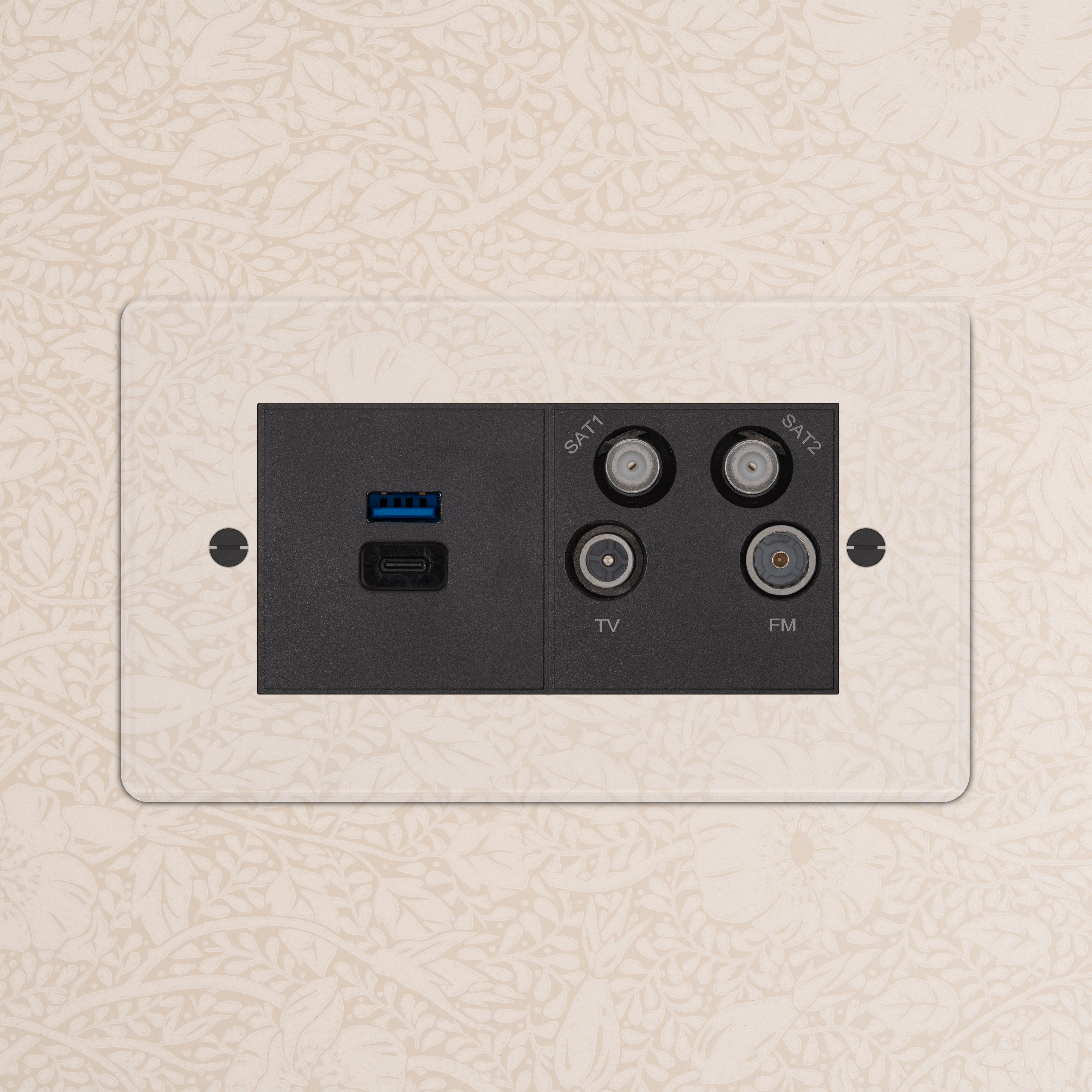 Neatly group two satellite connections, TV and FM aerials with USB A and C charging ports.