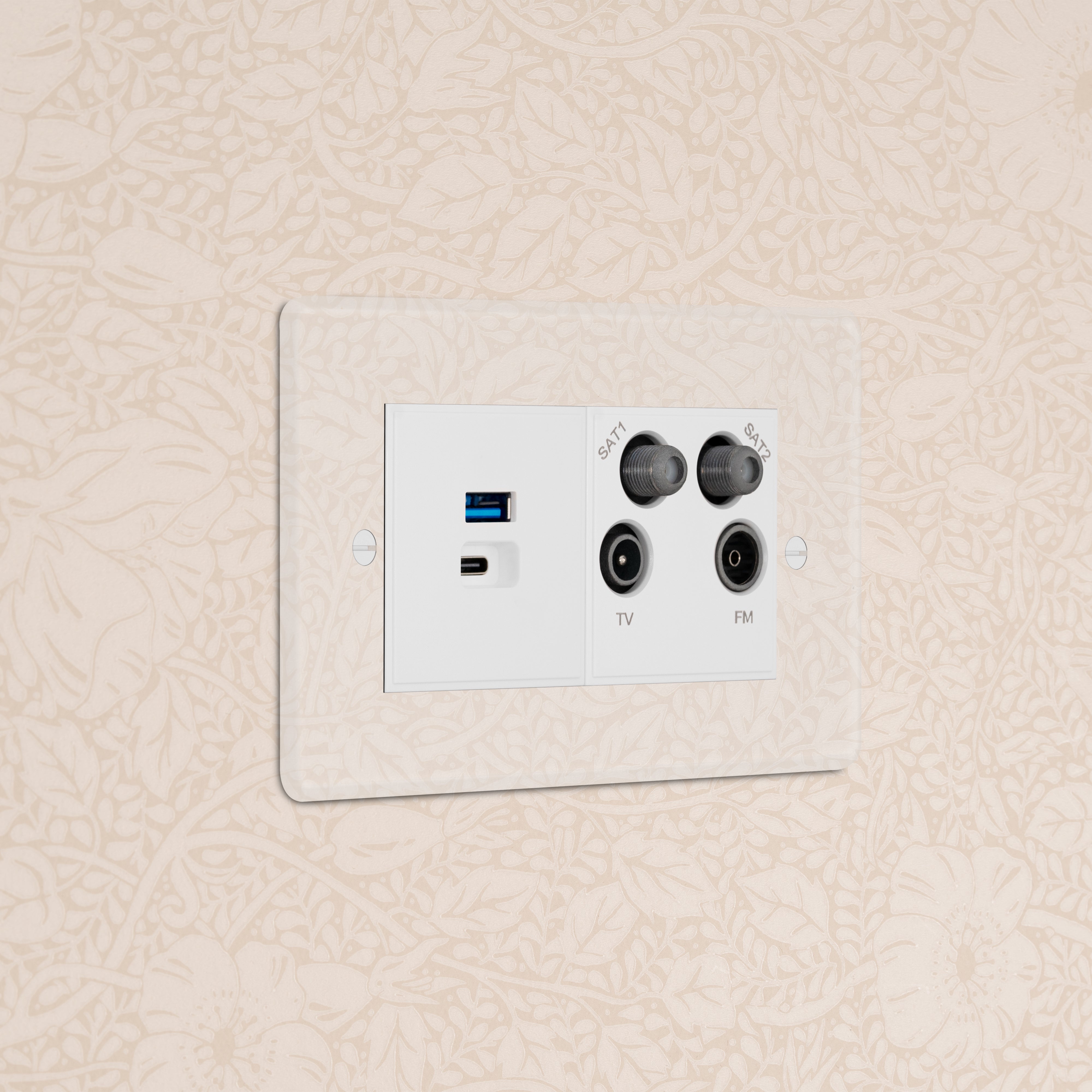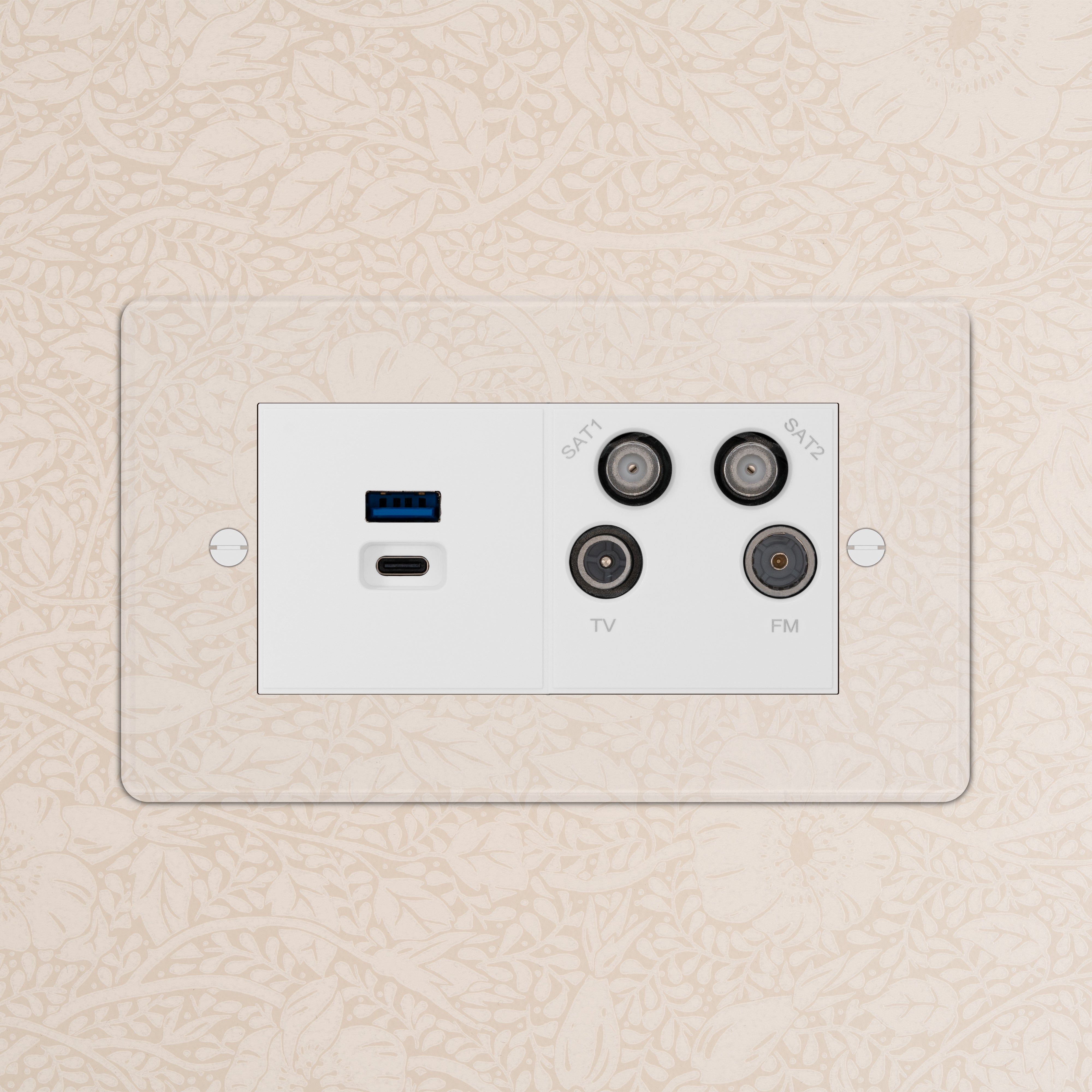 Neatly group two satellite connections, TV and FM aerials with USB A and C charging ports.